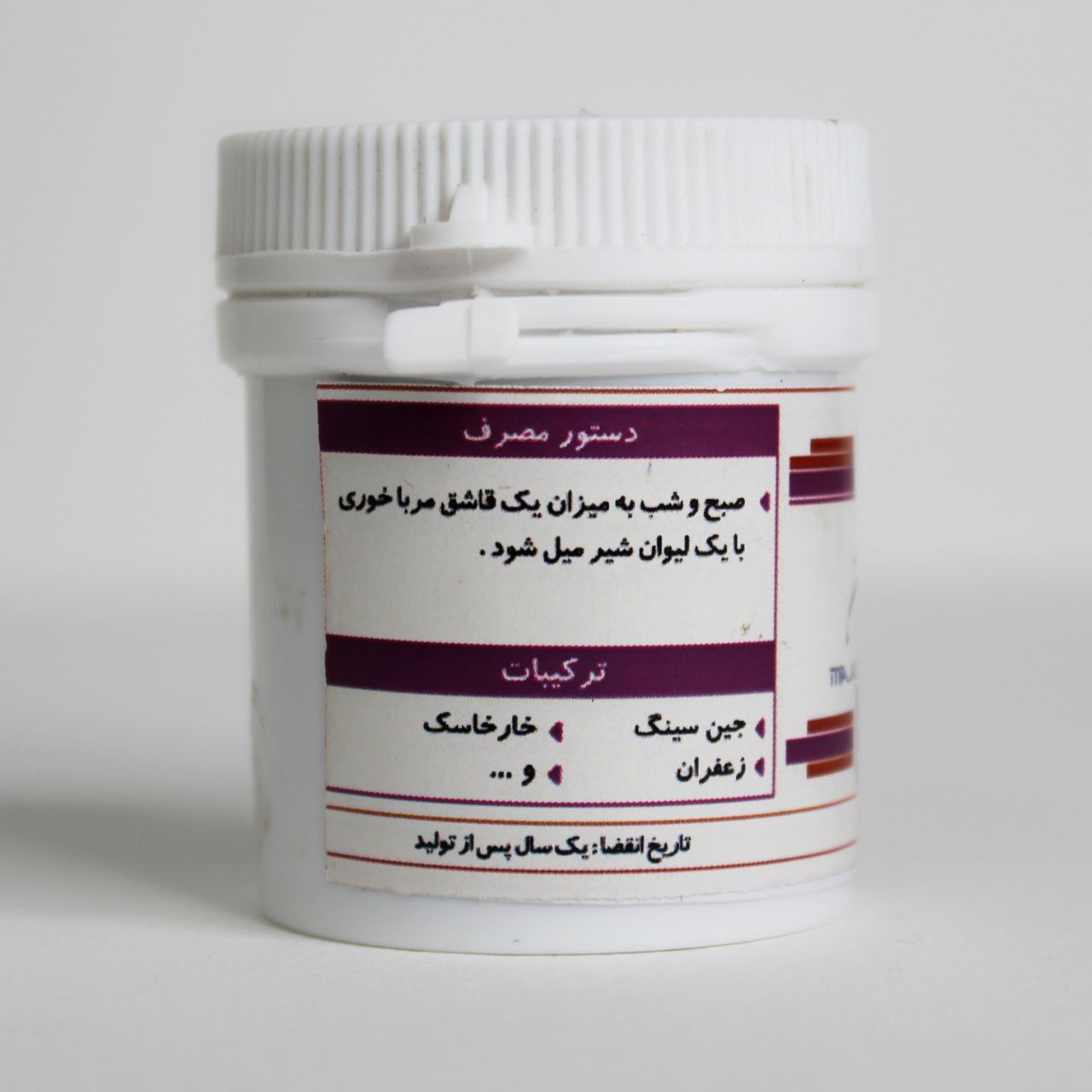 - دستور مصرف: صبح و شب به میزان ١ قاشق مربا خوری با یک لیوان شیر ولرم مصرف شود. نکته: در یخچال نگهداری شود.